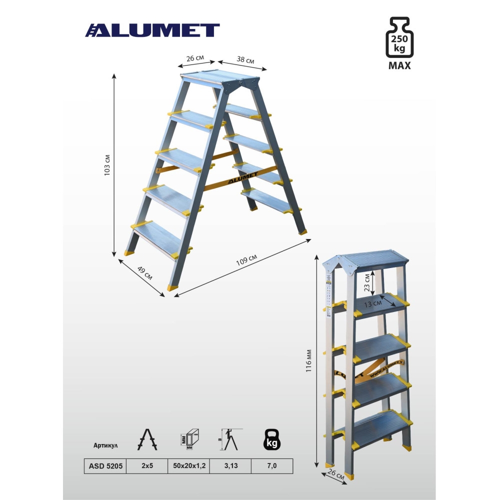 Двухсторонняя стремянка алюминиевая анодированная, ширина ступени 130 мм. 5 ст. ASD5205 Алюмет