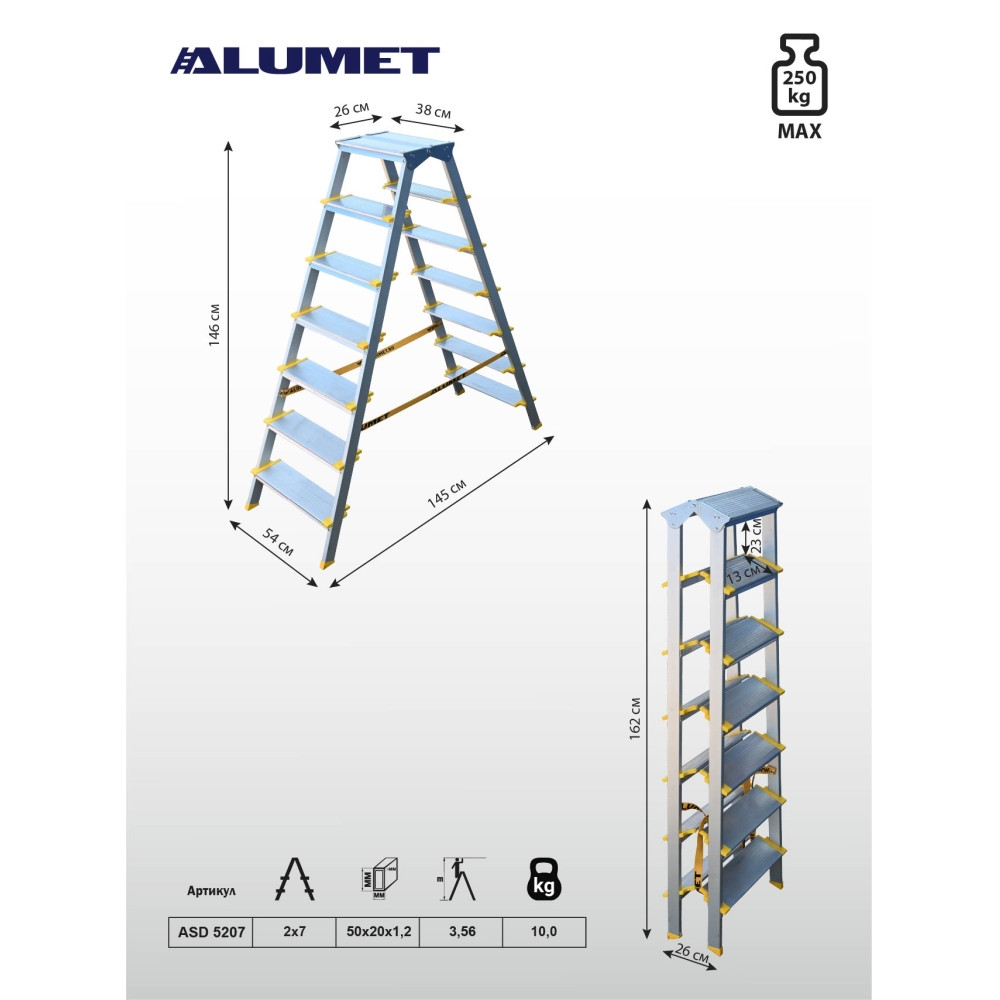 Двухсторонняя стремянка алюминиевая анодированная, ширина ступени 130 мм. 7 ст. ASD5207 Алюмет