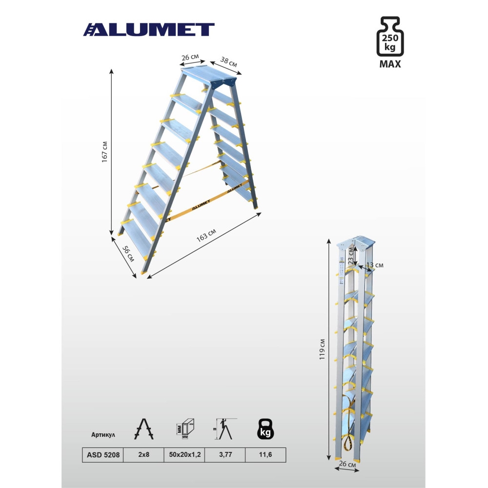 Двухсторонняя стремянка алюминиевая анодированная, ширина ступени 130 мм. 8 ст. ASD5208 Алюмет