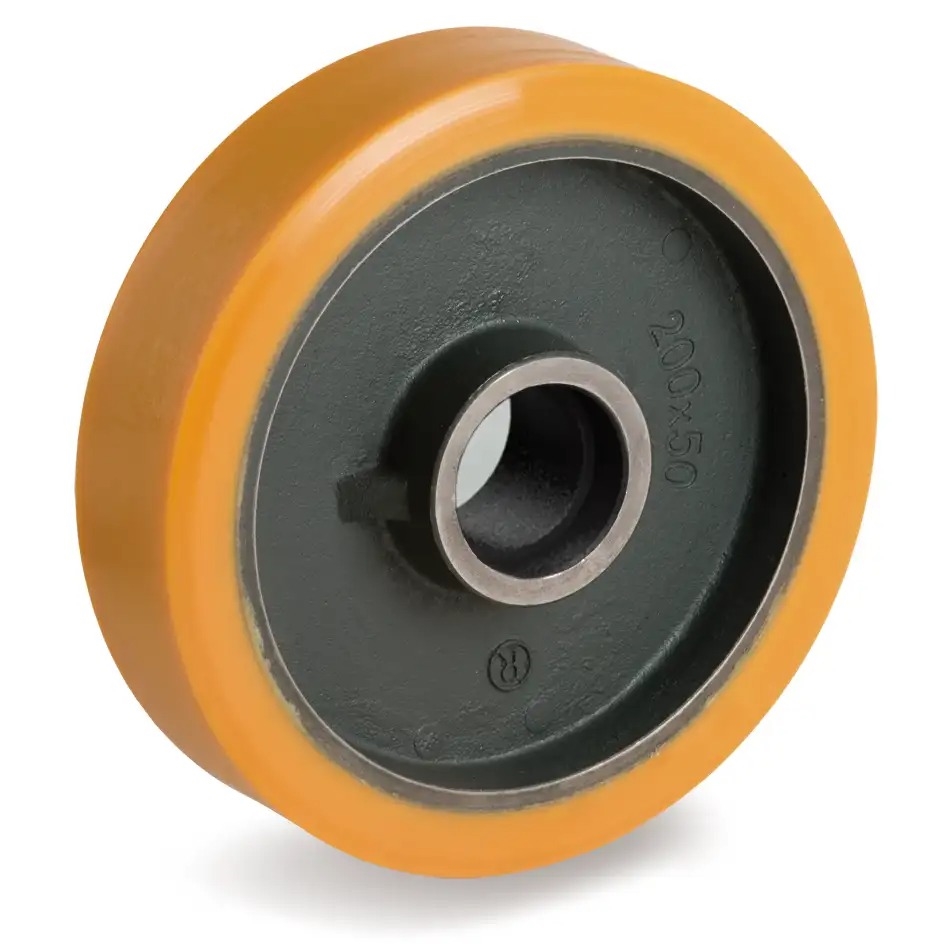 Полиуретановая шинка отличается высокой прочностью на разрыв, устойчивостью к трещинам и способностью выдерживать значительные нагрузки. Чугунный сердечник позволяет справляться с большими весами даже при небольших диаметрах. Ступица под шариковый подшипник (в комплект не входит, подбирается отдельно).