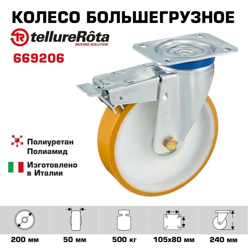 Колесо большегрузное Tellure Rota 669206 поворотное с тормозом (200 мм; 500 кг), полиуретан, полиамид