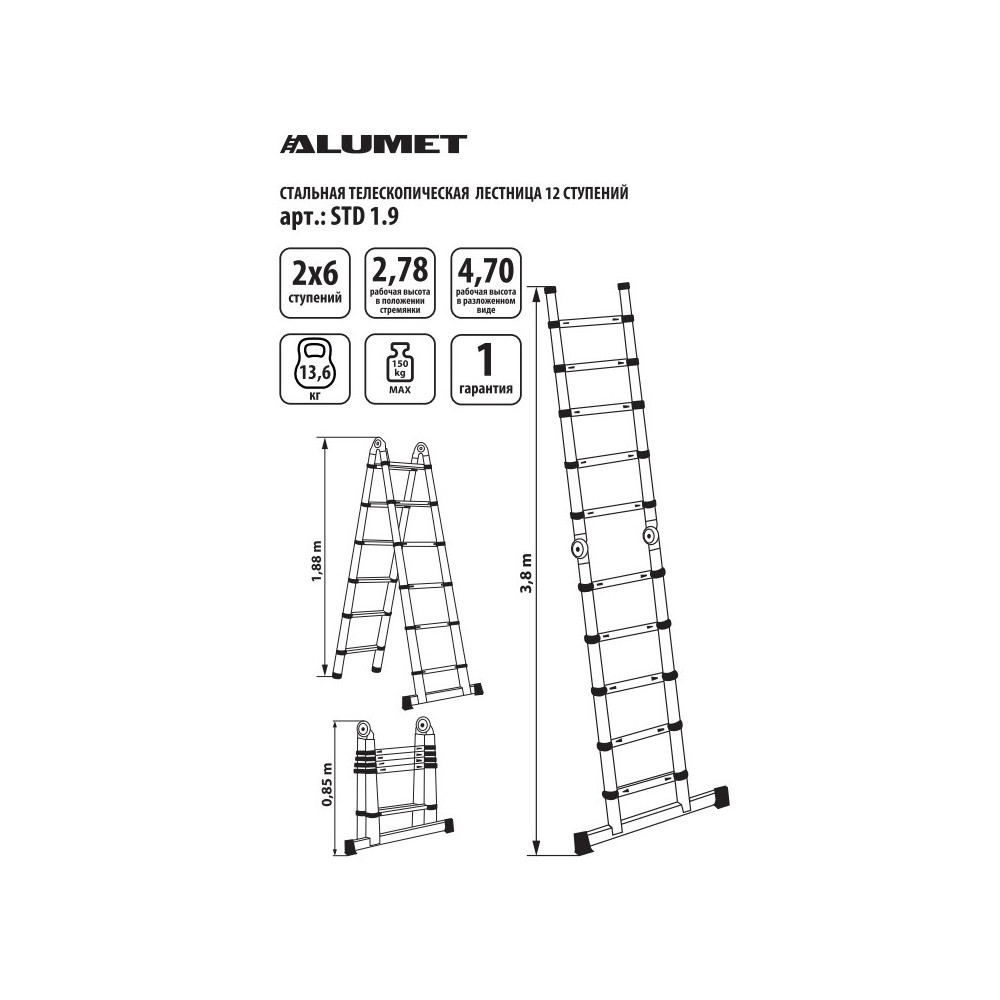 Лестница стальная телескопическая двухсторонняя с шарниром 1.9+1.9м. (6+6 ступ) STD1.9 Алюмет