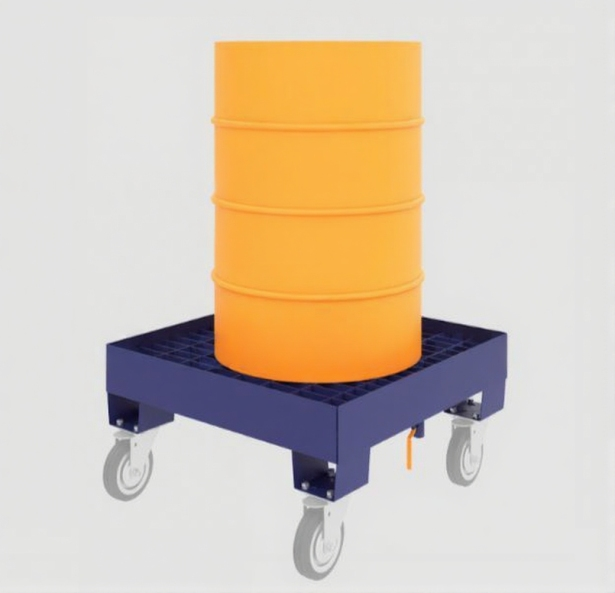 Конструкция поддона для бочек металлическая, сварная. Решетки для установки емкостей из стального листа с пазами - съемные. Для слива остатков жидкостей в дне поддона имеется резьбовое отверстие, с установленным шаровым сливным краном. Опоры коробчатой формы под погрузчик.