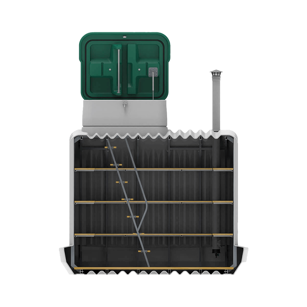 Бесшовный корпус, арочные рёбра жёсткости и металлический каркас из профиля 60х30х3 выдерживают самые высокие нагрузки и давление грунта. А широкая пригрузочная юбка препятствует всплытию погреба при высоком уровне грунтовых вод.