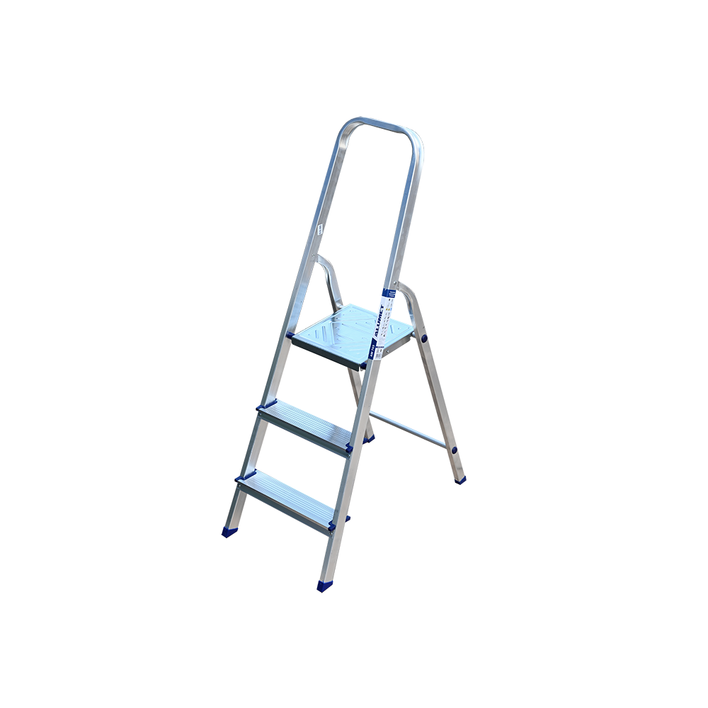 Стремянка алюминиевая изготовлена из высокопрочного алюминиевого профиля. Задняя и передняя нога соединены между собой. Рабочая площадка выполнена из оцинкованной стали. Ступени имеют рифленую поверхность. Башмаки изготовлены из высокопрочного пластика. Стремянка в рабочем положении надежно фиксируется рабочей площадкой, а начиная с пятиступенчатой и выше страховочными ремнями. Количество ступеней от 3-х до 10-и. Стремянка алюминиевая серии АМ предназначена для проведения различных видов работ на высоте до 4 м как в быту, так и на производстве.