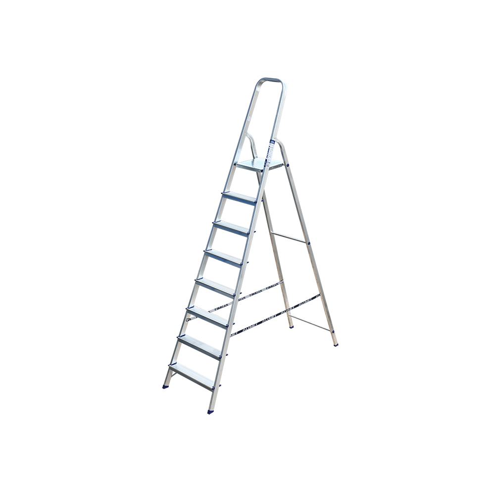 Стремянка алюминиевая изготовлена из высокопрочного алюминиевого профиля. Задняя и передняя нога соединены между собой. Рабочая площадка выполнена из оцинкованной стали. Ступени имеют рифленую поверхность. Башмаки изготовлены из высокопрочного пластика. Стремянка в рабочем положении надежно фиксируется рабочей площадкой, а начиная с пятиступенчатой и выше страховочными ремнями. Количество ступеней от 3-х до 10-и. Стремянка алюминиевая серии АМ предназначена для проведения различных видов работ на высоте до 4 м как в быту, так и на производстве.
