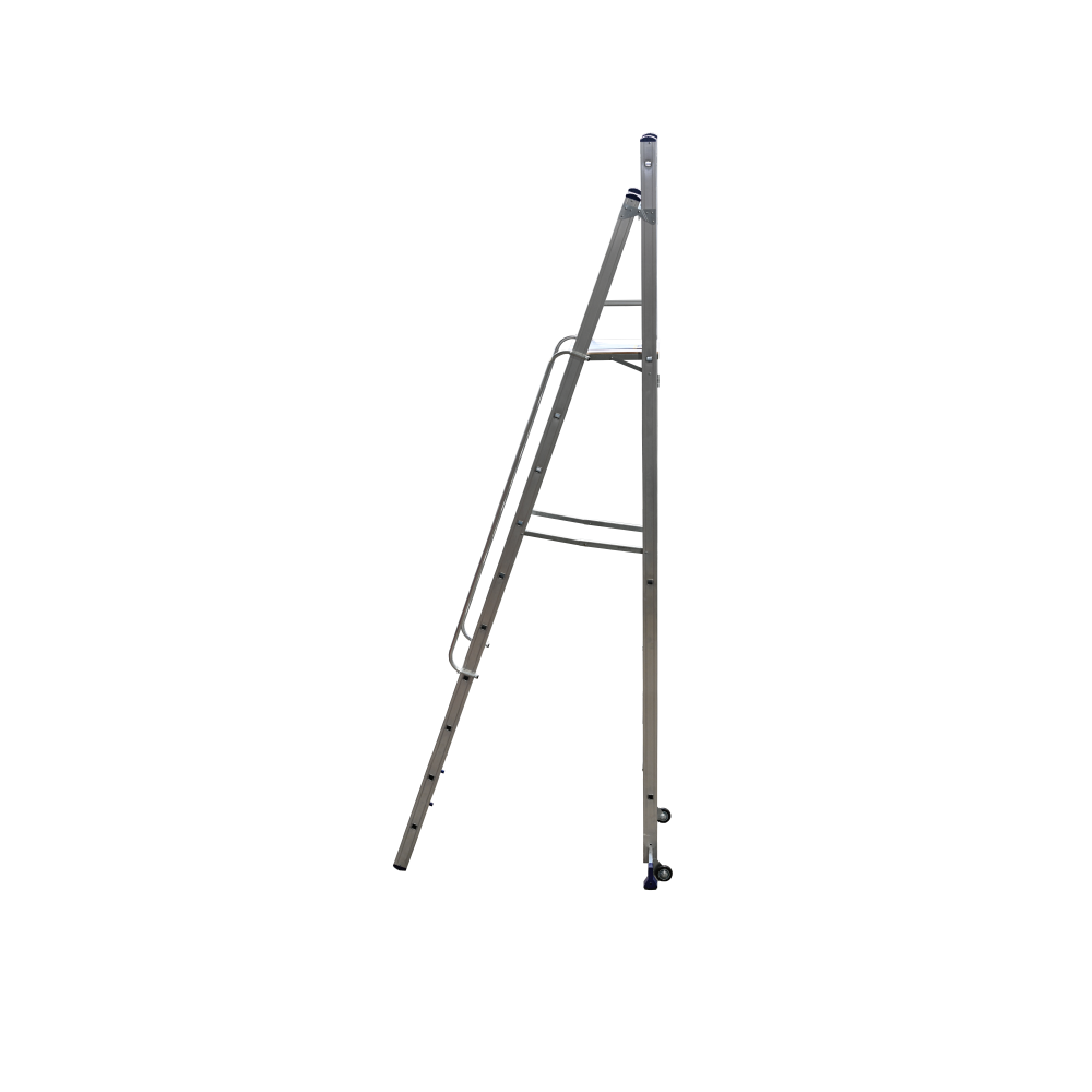 Стремянка-помост алюминиевая профессиональная серии АРЕ предназначена для проведения различных видов работ на высоте до 4,75м, как в быту, так и на производстве. Стремянка - помост представляет собой свободностоящую переносную лестницу, имеющую сторону подъема (переднюю ногу), опорную сторону (заднюю ногу), рабочую площадку и раскладывающуюся для подъема на высоту. В верхней части задней ноги стремянки имеется поперечина, которая выполняет роль периллы и обеспечивает безопасность при работе. Для жесткости на задней ноге имеются диагонали. На задней ноге внизу находится стабилизатор с колесами для АРЕ 1406, АРЕ1407, АРЕ 1408, АРЕ1409, АРЕ 1410, для АРЕ 1404, АРЕ 1405 – стабилизатор без колес (АРЕ1403 – без стабилизатора). Задняя и передняя ноги соединены между собой. Для удобства подъема к тетивам передней ноги крепятся поручни (кроме АРЕ1403, АРЕ 1404, АРЕ1405). Стремянка в рабочем положении надежно фиксируется рабочей площадкой и страховочными складывающимися металлическими стяжками (кроме АРЕ 1403, АРЕ 1404). Рабочая площадка выполнена из влагостойкой ламинированной нескользящей фанеры, которая крепится на стальные уголки. Тетивы и ступени стремянки изготовлены из высокопрочного алюминиевого профиля. Ступени имеют рифленую поверхность. Массивные башмаки изготовлены из высокопрочного обрезиненного пластика. В рабочем состоянии стремянку-помост можно плотно приставить к стене или другим объектам.