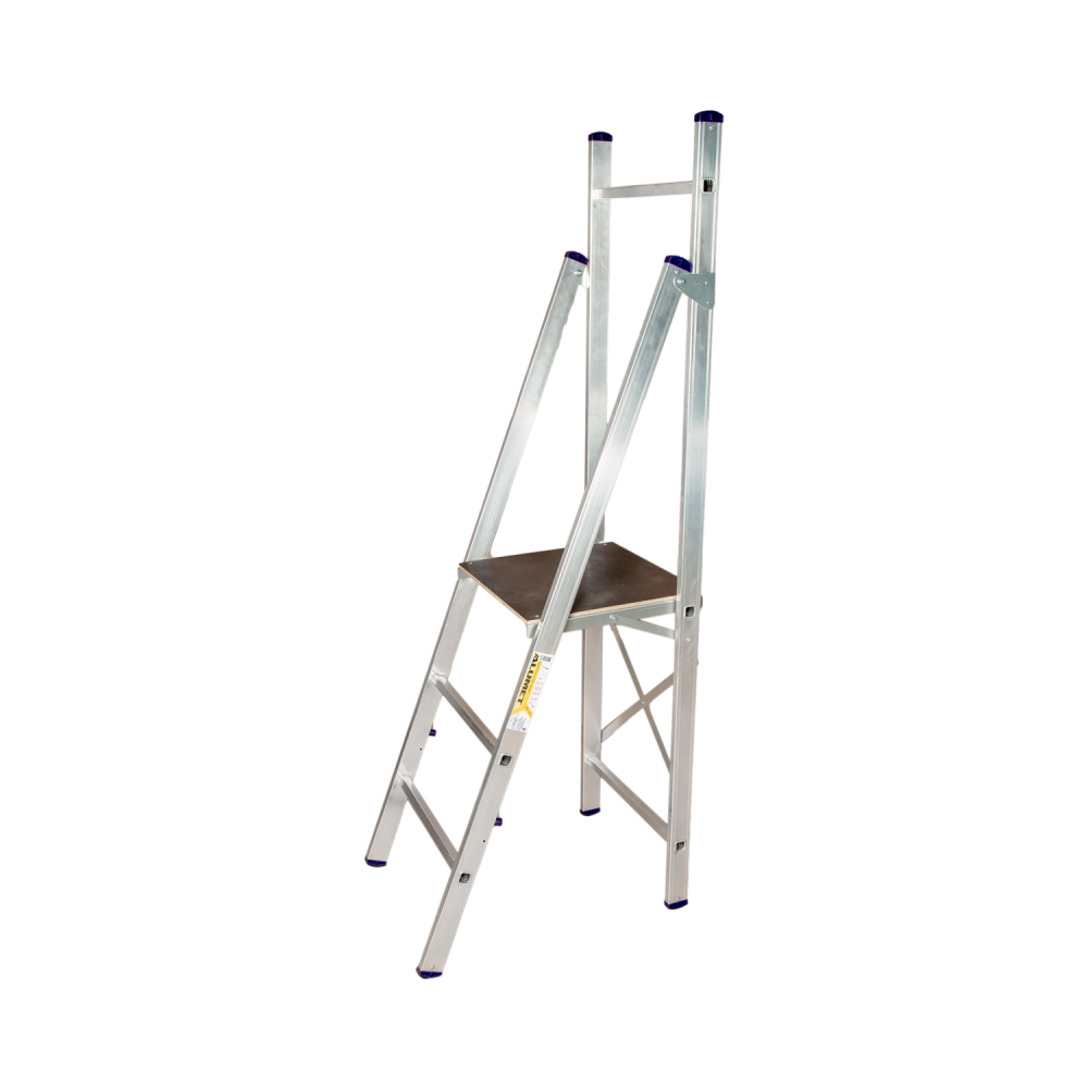Стремянка-помост алюминиевая профессиональная серии АРЕ предназначена для проведения различных видов работ на высоте до 4,75м, как в быту, так и на производстве. Стремянка - помост представляет собой свободностоящую переносную лестницу, имеющую сторону подъема (переднюю ногу), опорную сторону (заднюю ногу), рабочую площадку и раскладывающуюся для подъема на высоту. В верхней части задней ноги стремянки имеется поперечина, которая выполняет роль периллы и обеспечивает безопасность при работе. Для жесткости на задней ноге имеются диагонали. На задней ноге внизу находится стабилизатор с колесами для АРЕ 1406, АРЕ1407, АРЕ 1408, АРЕ1409, АРЕ 1410, для АРЕ 1404, АРЕ 1405 – стабилизатор без колес (АРЕ1403 – без стабилизатора). Задняя и передняя ноги соединены между собой. Для удобства подъема к тетивам передней ноги крепятся поручни (кроме АРЕ1403, АРЕ 1404, АРЕ1405). Стремянка в рабочем положении надежно фиксируется рабочей площадкой и страховочными складывающимися металлическими стяжками (кроме АРЕ 1403, АРЕ 1404). Рабочая площадка выполнена из влагостойкой ламинированной нескользящей фанеры, которая крепится на стальные уголки. Тетивы и ступени стремянки изготовлены из высокопрочного алюминиевого профиля. Ступени имеют рифленую поверхность. Массивные башмаки изготовлены из высокопрочного обрезиненного пластика. В рабочем состоянии стремянку-помост можно плотно приставить к стене или другим объектам.