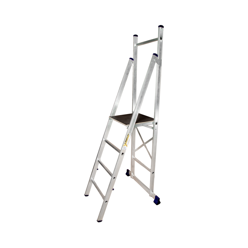 Стремянка-помост алюминиевая профессиональная серии АРЕ предназначена для проведения различных видов работ на высоте до 4,75м, как в быту, так и на производстве. Стремянка - помост представляет собой свободностоящую переносную лестницу, имеющую сторону подъема (переднюю ногу), опорную сторону (заднюю ногу), рабочую площадку и раскладывающуюся для подъема на высоту. В верхней части задней ноги стремянки имеется поперечина, которая выполняет роль периллы и обеспечивает безопасность при работе. Для жесткости на задней ноге имеются диагонали. На задней ноге внизу находится стабилизатор с колесами для АРЕ 1406, АРЕ1407, АРЕ 1408, АРЕ1409, АРЕ 1410, для АРЕ 1404, АРЕ 1405 – стабилизатор без колес (АРЕ1403 – без стабилизатора). Задняя и передняя ноги соединены между собой. Для удобства подъема к тетивам передней ноги крепятся поручни (кроме АРЕ1403, АРЕ 1404, АРЕ1405). Стремянка в рабочем положении надежно фиксируется рабочей площадкой и страховочными складывающимися металлическими стяжками (кроме АРЕ 1403, АРЕ 1404). Рабочая площадка выполнена из влагостойкой ламинированной нескользящей фанеры, которая крепится на стальные уголки. Тетивы и ступени стремянки изготовлены из высокопрочного алюминиевого профиля. Ступени имеют рифленую поверхность. Массивные башмаки изготовлены из высокопрочного обрезиненного пластика. В рабочем состоянии стремянку-помост можно плотно приставить к стене или другим объектам.